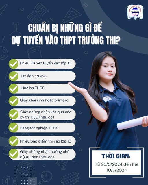 – Đối với học sinh tham gia kỳ thi vào 10 THPT công lập năm học 2024 – 2025: nộp hồ sơ trong vòng 01 tuần kể từ ngày công bố điểm chuẩn theo lịch của Sở GD&ĐT Thanh Hoá (bao gồm cả thứ 7 và Chủ nhật; học sinh phải có Phiếu báo điểm hoặc minh chứng thể hiện kết quả thi)